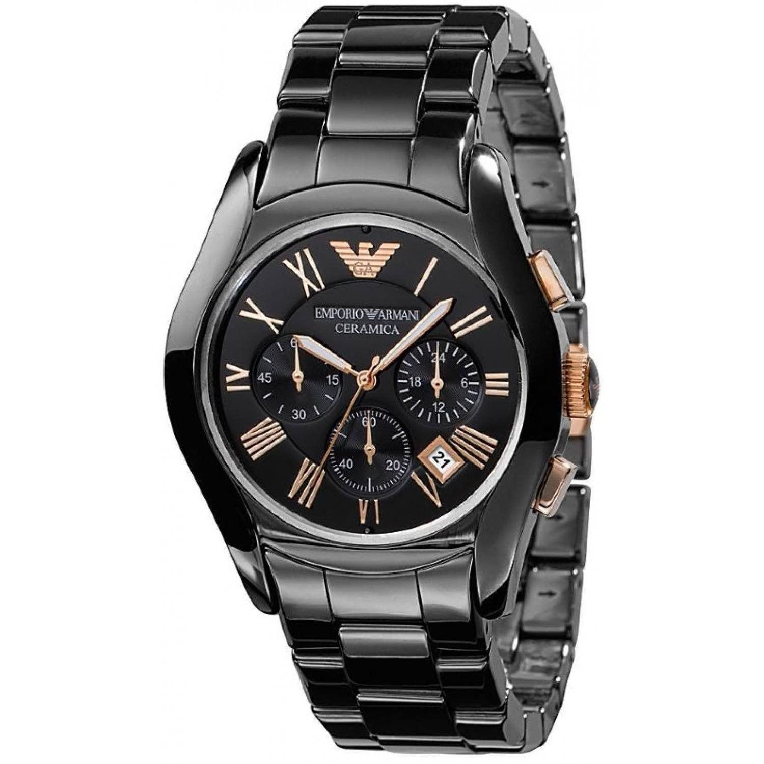 This Emporio Armani AR1410 chronograph features both modern and vintage elements, with a black ceramic bracelet, 42mm black ceramic encasing, a black dial with Roman numeral markers, and accents in rose gold. Mineral glass protects the timepiece from scratches, and it is water resistant up to 30 meters. This men's watch is versatile and can be worn at the gym or in the boardroom.