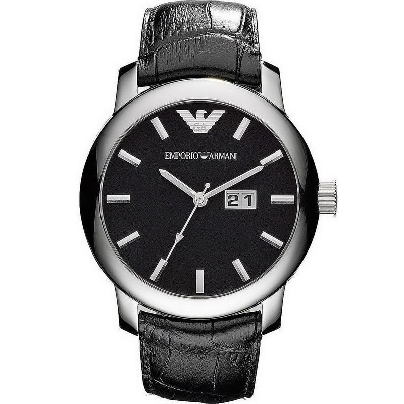 The Emporio Armani AR0643 watch has a black croco-embossed leather strap that complements its black Roman numeral dial. Mineral crystal glass makes it durable and scratch resistant. The wide-rimmed stainless steel case gives this otherwise casual-looking timepiece a bolder, more luxurious look.